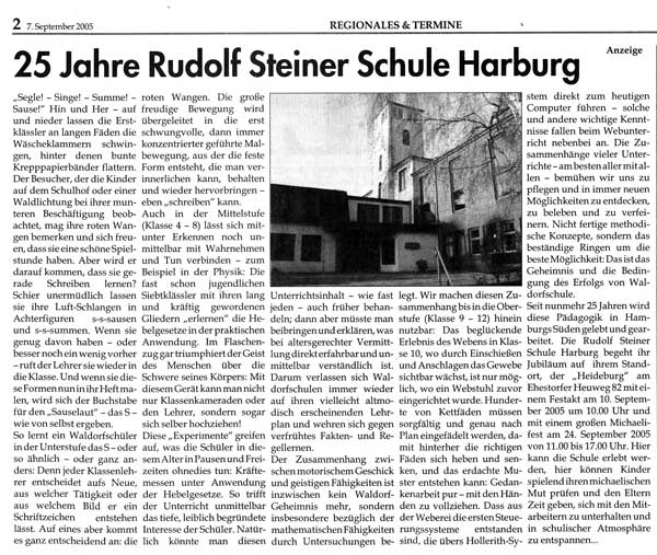 Seit nunmehr 25 Jahren wird diese Pädagogik in Hamburgs Süden gelebt und gearbeitet. Die Rudolf Steiner Schule Harburg begeht ihr Jubiläum auf ihrem Standort, der "Heideburg" am Ehestorfer Heuweg 82 mit einem Festakt am 10. September 2005 um 10.00 Uhr und mit einem großen Michaelifest am 24. September 2005 von 11.00 bis 17.00 Uhr. Hier kann die Schule erlebt werden, hier können Kinder spielend ihren michaelischen Mut prüfen und den Eltern Zeit geben, sich mit den Mitarbeitern zu unterhalten und in schulischer Atmosphäre zu entspannen.. |