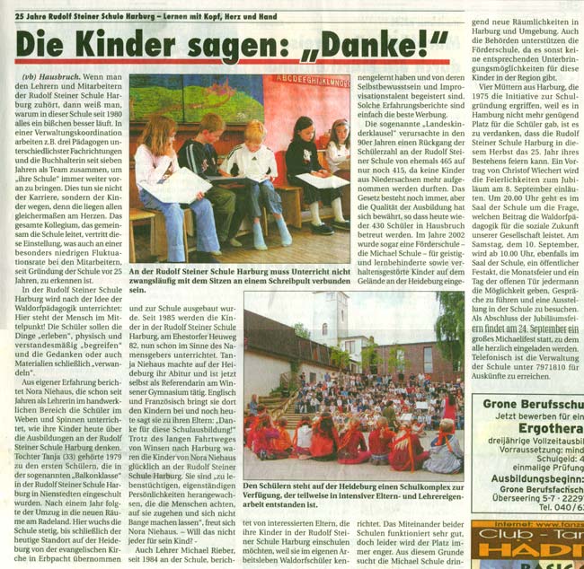 und zur Schule ausgebaut wurde. Seit 1985 werden die Kinder in der Rudolf Steiner Schule Harburg, am Ehestorfer Heuweg 82, nun schon im Sinne des Namensgebers unterrichtet. Tanja Niehaus machte auf der Heideburg ihr Abitur und ist jetzt selbst als Referendarin am Win-sener Gymnasium tätig. Englisch und Französisch bringt sie dort den Kindern bei und noch heute sagt sie zu ihren Eltern: „Danke für diese Schulausbildung!" Trotz des langen Fahrtweges von Winsen nach Harburg waren die Kinder von Nora Niehaus glücklich an der Rudolf Steiner Schule Harburg. Sie sind „zu lebenstüchtigen, eigenständigen Persönlichkeiten herangewachsen, die die Menschen achten, auf sie zugehen und sich nicht Bange machen lassen", freut sich Nora Niehaus. - Will das nicht jeder für sein Kind? -